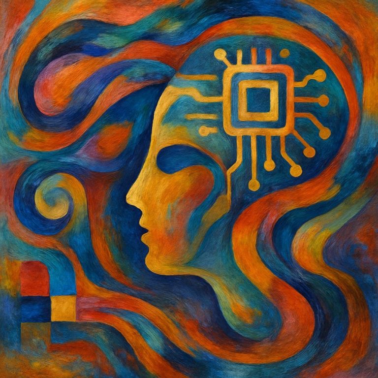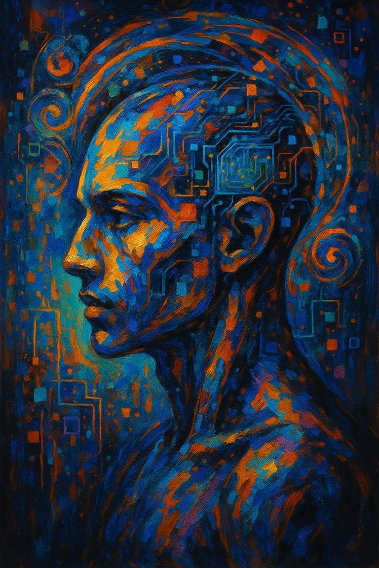 Neurale Echo is een intrigerend digitaal kunstwerk dat het kruispunt verkent tussen mens en machine, bewustzijn en code. De krachtige zijaanzichtcompositie toont een menselijke figuur, opgebouwd uit levendige penseelstreken in diepblauwe, vurige oranje en elektrische accenten. Geometrische patronen en circuits vloeien samen met organische vormen, wat een visuele symbiose oproept tussen natuurlijke intelligentie en artificiële structuren. Het werk nodigt de toeschouwer uit om na te denken over de toekomst van identiteit in een wereld waar technologie en emotie steeds meer verweven raken.