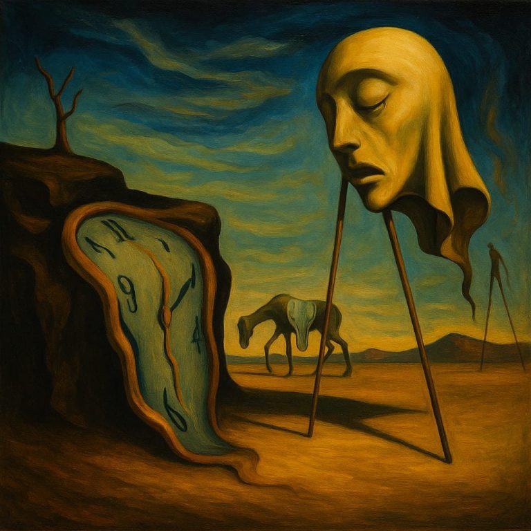 Deze AI-gecreëerde compositie nodigt uit tot reflectie op de fragiliteit van het menselijk bewustzijn en de ongrijpbaarheid van tijd. Het resultaat is een digitaal surrealistisch schilderij dat tegelijkertijd bevreemdend én intiem aanvoelt.