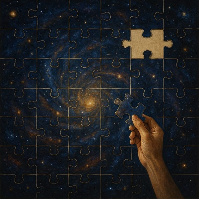 De Kosmische Puzzel is een filosofisch en visueel krachtig schilderij dat het universum verbeeldt als een immense legpuzzel, waarvan slechts enkele stukjes zijn ingevuld. Tegen een achtergrond van sterrenstelsels, spiraalnevels en kosmisch duister toont een menselijke hand een enkel puzzelstukje – een subtiele verwijzing naar de menselijke zoektocht naar begrip en betekenis.