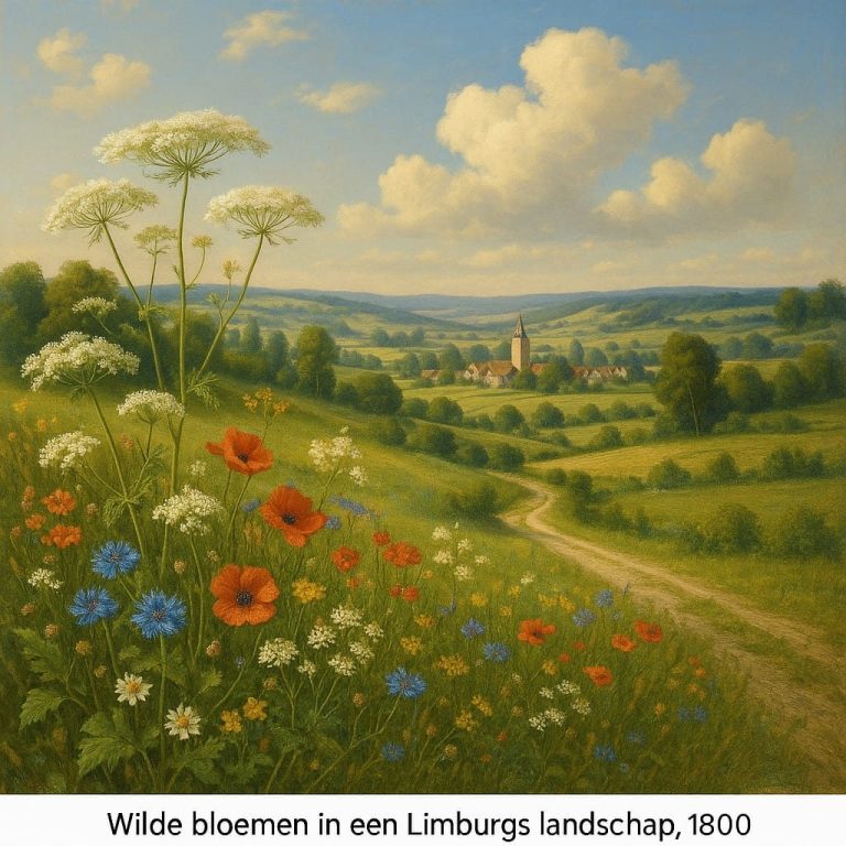 Een romantisch olieverfschilderij dat een zonovergoten zomerdag vangt in het glooiende Limburgse landschap rond 1800. Op de voorgrond bloeien wilde bloemen uitbundig: klaprozen, korenbloemen, margrieten en fluitenkruid. Hun levendige kleuren contrasteren met het zachtgroene landschap dat zich uitstrekt tot aan een schilderachtig dorpje, waar een kerktoren boven de bomen uittorent. De kronkelende zandweg leidt de blik de diepte in, langs weiden en heggen, onder een lichtblauwe hemel vol wolkenpluimen.