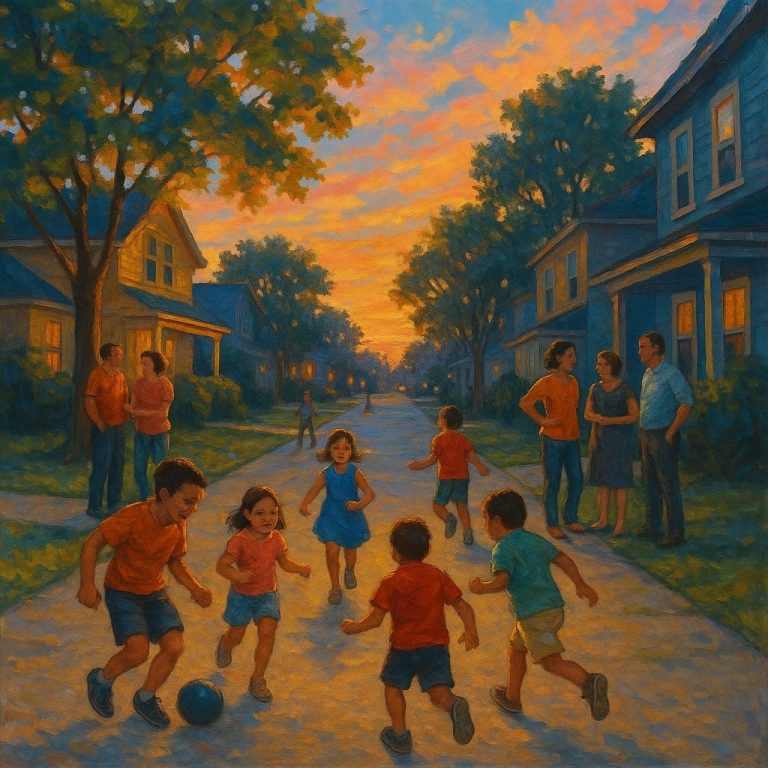 Zomeravond Rhythmiek vangt het warme samenspel van een buurt op haar mooist: kinderen die nog nét wat langer mogen buitenspelen, de straat gevuld met hun gelach en snelle voetstappen, terwijl de lucht boven hen gloeit in tinten van oranje en roze. Langs de stoep praten buren ontspannen met elkaar, omringd door de gloed van veranda’s en het zachte licht van de ondergaande zon. In dit werk staat verbondenheid centraal — tussen jong en oud, tussen buren, tussen het dagelijkse en het bijzondere. Een ode aan eenvoudige, gedeelde vreugde op een zwoele zomerse avond.