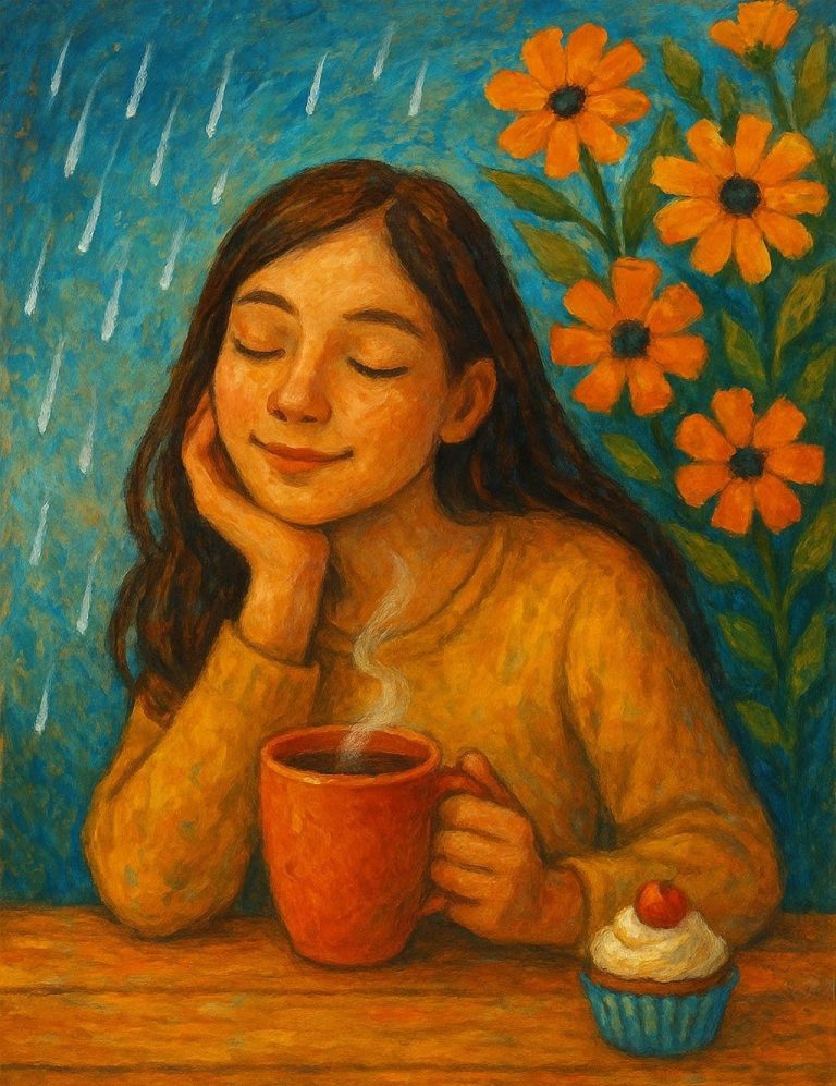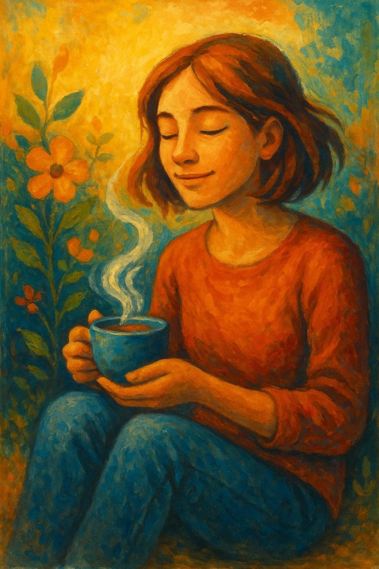 Een Moment van Stil Geluk vangt de essentie van rust en aanwezigheid. In dit warme, schilderachtige tafereel zien we een jonge vrouw die haar ogen gesloten houdt terwijl ze een dampende kop thee vasthoudt — een ode aan de schoonheid van eenvoud. De zachte kleuren, het lichtspel en de bloemrijke achtergrond nodigen de toeschouwer uit om even stil te staan en te voelen.