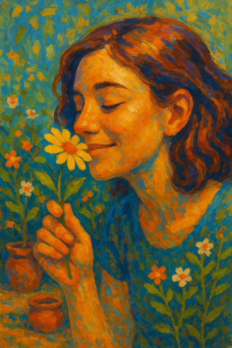 De schilderstijl, rijk aan textuur en kleur, weerspiegelt een expressieve maar harmonieuze wereld waarin stilte en zintuiglijke beleving centraal staan. Het werk nodigt de toeschouwer uit om ook zelf stil te staan, te ruiken, te voelen — en te herinneren dat geluk vaak schuilt in het kleinste gebaar.
