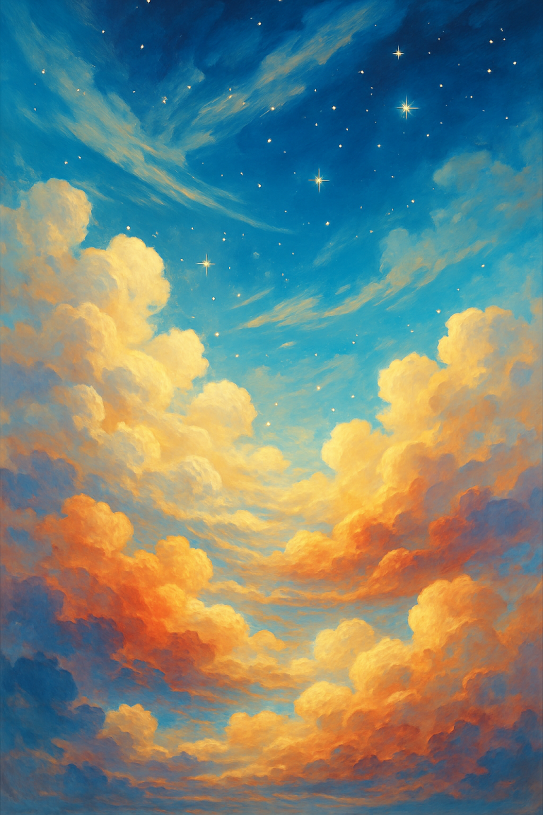 "Hemelspraak" is een expressieve interpretatie van het hemelse rijk, waarin kleur en beweging samenkomen om de grootsheid van het universum te verbeelden. Met zachte overgangen van turkoois naar vurige oranjetinten roept het werk zowel rust als ontzag op. De schilderachtige penseelstreken en etherische lichtval geven het gevoel alsof je kijkt naar een droom tussen de wolken en de sterren. Dit kunstwerk nodigt de toeschouwer uit om na te denken over de verbinding tussen aarde en kosmos – en wat daarboven ligt