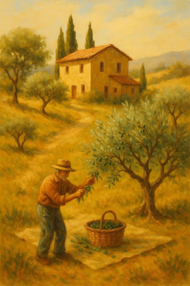 “De Olijfoogst in Toscane” is een warm en tijdloos schilderij dat de essentie van het Italiaanse platteland vangt. In dit werk staat een klassieke Toscaanse boerderij centraal, omringd door glooiende heuvels en zilvergroene olijfbomen. Op de voorgrond zien we een boer — met hoed en opgerolde mouwen — die met toewijding de olijven oogst, een tafereel dat rust en eenvoud uitstraalt.