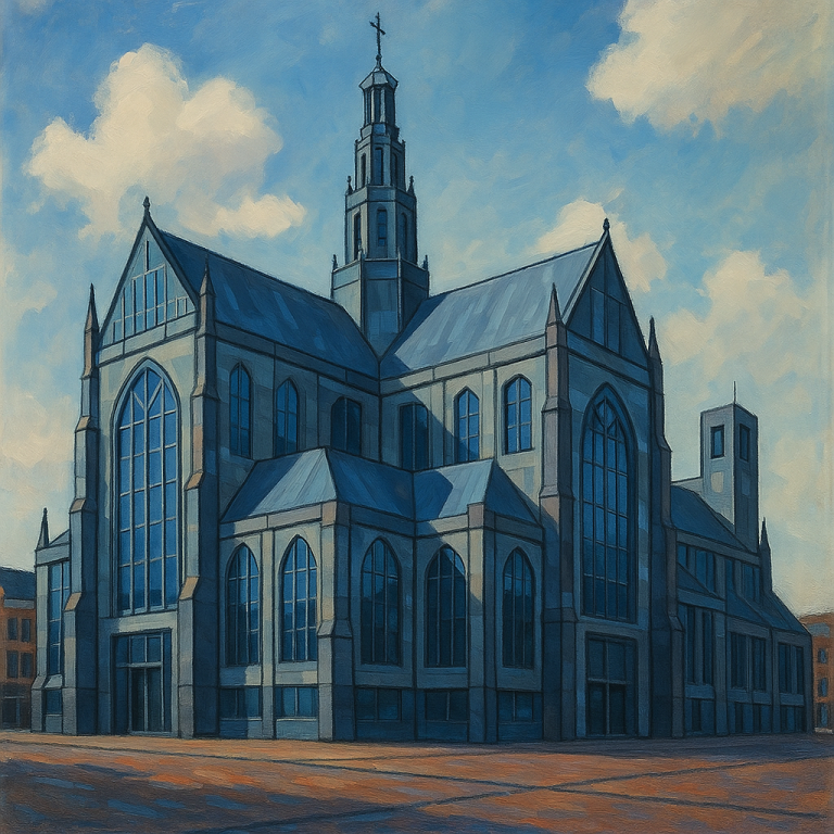 Dit schilderij toont een moderne interpretatie van de Bavo Kerk in Haarlem. De klassieke gotische structuur is behouden, maar er zijn duidelijk hedendaagse elementen toegevoegd: grote glazen ramen, strakke lijnen en een minimalistische afwerking. De torens en spitsbogen zijn nog aanwezig, maar in een vereenvoudigde stijl die doet denken aan moderne architectuur. De kleuren zijn helder en contrastrijk, wat het geheel een frisse, bijna futuristische uitstraling geeft. Het plein voor de kerk is open en leeg, waardoor de aandacht volledig naar het gebouw gaat.