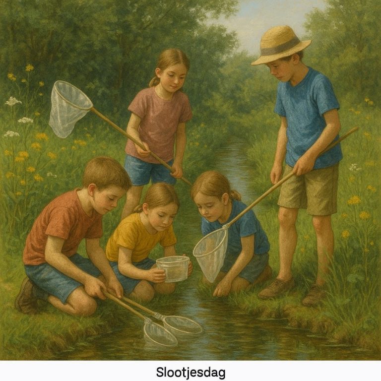 In dit nostalgische olieverfschilderij wordt een zomerse dag tijdens het jaarlijkse natuuruitje "Slootjesdag" vastgelegd. Vier kinderen buigen zich vol verwondering over een kabbelende sloot, gewapend met schepnetjes en een plastic bakje om hun vangst te bekijken. Hun kleding is eenvoudig en kleurrijk, passend bij het speelse karakter van de dag. Het schilderij ademt de sfeer van ongedwongen buiten spelen, ontdekking en verbondenheid met de natuur.