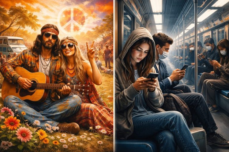 Vrijheid versus Verbinding toont een scherp visueel contrast tussen twee tijdperken die slechts enkele generaties van elkaar verwijderd zijn, maar emotioneel werelden uiteen lijken te liggen. Aan de ene zijde ademt het werk de vrije geest van de jaren zestig: open landschappen, warme kleuren, muziek, lichamelijke nabijheid en een collectief gevoel van idealisme en verbondenheid. De figuren leven in het moment, ongefilterd en zichtbaar met elkaar in contact.