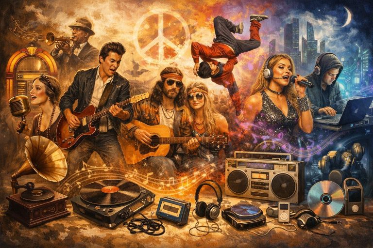 De Tijdlijn van Klank is een visueel eerbetoon aan de evolutie van muziek en haar onlosmakelijke band met de mens. Het kunstwerk neemt de kijker mee op een reis door de tijd, waarin muzikale stijlen, iconische instrumenten en veranderende technologieën samensmelten tot één dynamisch geheel. Van de warme tonen van analoge klanken en vinyl tot de digitale beats en virtuele soundscapes van vandaag: elke periode weerspiegelt zijn eigen cultuur, emoties en maatschappelijke veranderingen.
