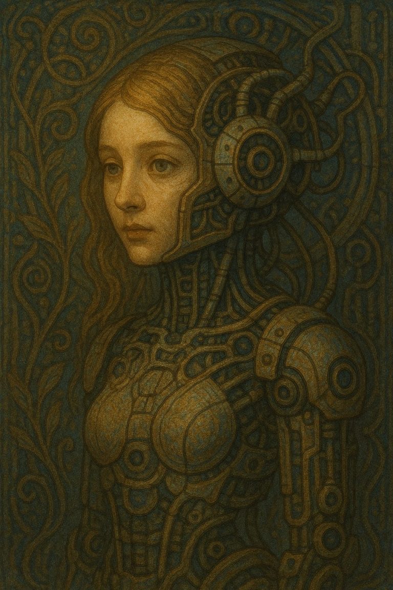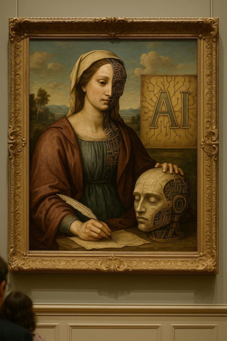 In dit renaissancestijl schilderij ontmoeten mens en machine elkaar in een poëtische symbiose. De afgebeelde figuur, half vrouw, half mechanisch wezen, symboliseert de versmelting van menselijke creativiteit en kunstmatige intelligentie. Haar serene blik en klassieke kleding verwijzen naar de menselijke oorsprong, terwijl de blootgelegde circuitstructuren en het zwevende AI-symbool een toekomst aanduiden waarin technologie een intrinsiek deel van ons bestaan wordt. Het werk stelt vragen over identiteit, bewustzijn en de plaats van AI in de evolutie van menselijke expressie. Een moderne ode aan de denkers van toen — én morgen.