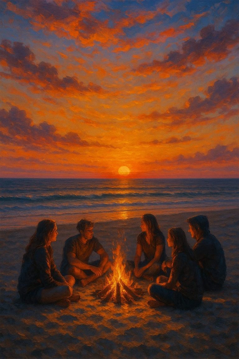 In Vuur aan de Einder vangt de kunstenaar een intiem moment van rust en verbondenheid. Op een stil strand, badend in de warme gloed van een ondergaande zon, zitten vijf mensen rond een knapperend kampvuur. De lucht is een schilderij op zich — doordrenkt met vurige tinten oranje, rood en violet, weerspiegeld in de golven van een kalme zee. De vlammen dansen zacht op het zand, hun licht weerspiegelt op gezichten vol ontspanning en vriendschap. Dit werk viert de schoonheid van het moment, waarin tijd even lijkt stil te staan en mens en natuur elkaar omarmen.