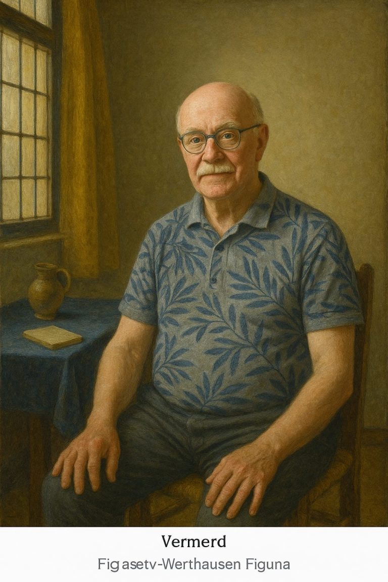 De Man met het Bladerenhemd is een treffend voorbeeld van hoe kunstmatige intelligentie de grenzen tussen het alledaagse en het tijdloze kan vervagen. In deze ogenschijnlijk klassieke compositie — met zachte lichtinval, warme aardetinten en een sobere interieursetting die aan Johannes Vermeer doet denken — zit een oudere man in hedendaagse kleding sereen voor het raam.