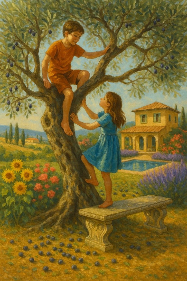 Zomermiddag in Toscane vangt een teder moment van jeugdige vrijheid te midden van een schilderachtig Italiaans landschap. Een jongen en een meisje klimmen speels in een oude olijfboom, hun lichamen badend in het warme licht van de late middagzon. Rond hen bloeien lavendel, rozen en zonnebloemen in volle pracht. Op de achtergrond staat een elegante Toscaanse villa met een helder zwembad, symbool van rust en rijkdom, terwijl onder de boom rijpe olijven op de aarde liggen verspreid. Een sierlijk gebeeldhouwd stenen bankje nodigt uit tot contemplatie of gesprek.