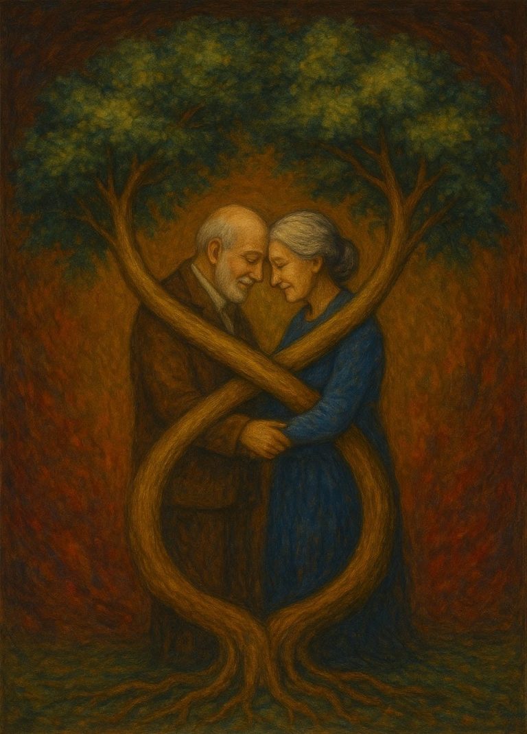 De warme kleuren en zachte penseelvoering ademen een gevoel van rust, wijsheid en tijdloosheid. Het werk stelt de liefde voor als iets dat niet vervaagt met de jaren, maar juist dieper wortelt en sterker groeit.