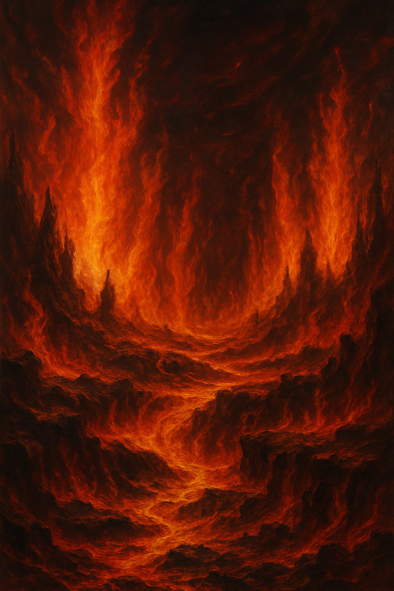 "Vuurspraak" werpt een intens en rauw licht op de verbeelding van de hel: een wereld vol chaos, verbranding en innerlijke strijd. In vurige tonen van rood, oranje en zwart slingeren lavastromen zich door een gescheurde, demonische horizon. De zware penseelstreken en dreigende wolken van rook roepen een gevoel van verstikking en confrontatie op. Dit werk onderzoekt niet alleen de klassieke onderwereld, maar ook de emotionele hel die zich in de mens kan afspelen. Een krachtig contrast met het hemelse, dit schilderij dwingt de toeschouwer om ook de donkere dimensies van bestaan onder ogen te zien.