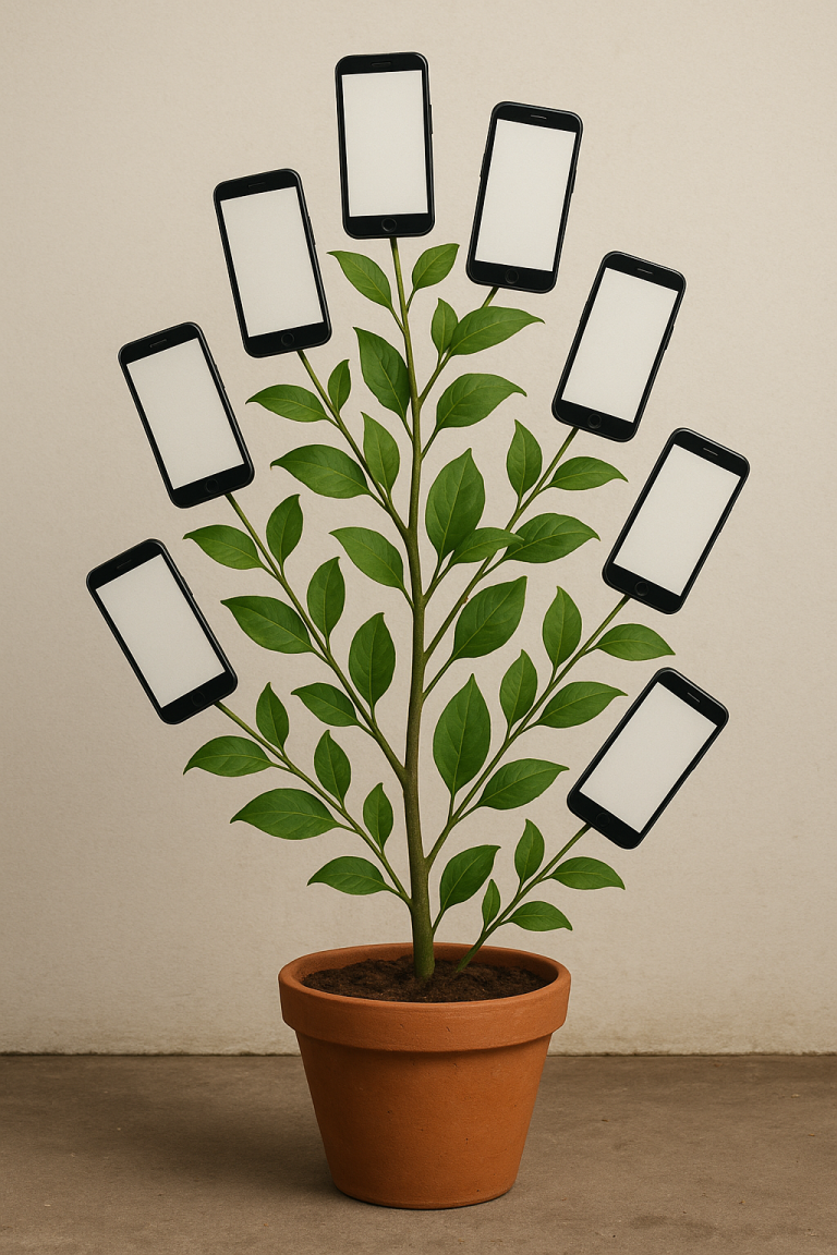 Dit kunstwerk toont een surrealistische plant waarin smartphones groeien in plaats van vruchten of bloemen. De combinatie van natuurlijke elementen (zoals bladeren en aarde) met technologie symboliseert hoe sterk mobiele telefoons zijn verweven met ons dagelijks leven. Het roept vragen op over de natuurlijke groei van technologische afhankelijkheid en reflecteert op thema's als digitale verslaving, de kunstmatigheid van moderne communicatie en de balans tussen natuur en technologie
