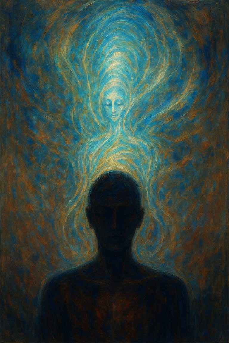 In De Opmars van de Ziel verbeeldt de kunstenaar het spirituele ontwaken van de mens. Vanuit een duister silhouet stijgt een etherische gedaante op – lichtgevend, sereen en vormloos als een gedachte. De ziel wordt hier niet afgebeeld als iets los van het lichaam, maar als een innerlijke kracht die zich ontvouwt en verbindt met iets groters dan het zelf.