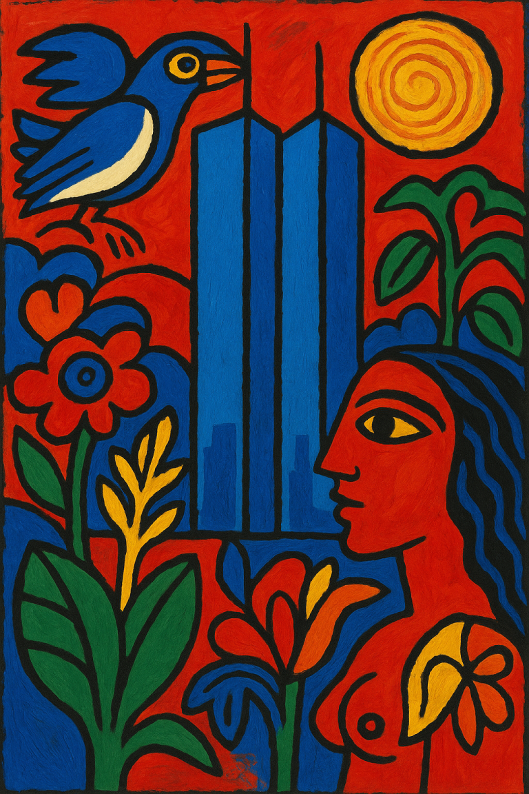 Deze levendige compositie toont een naakte vrouw tussen bloemen, een blauwe vogel, de zon – en onverwacht: de Twin Towers. In krachtige kleuren en vloeiende lijnen botsen natuur en stad, lichaam en geometrie, gevoel en vooruitgang.