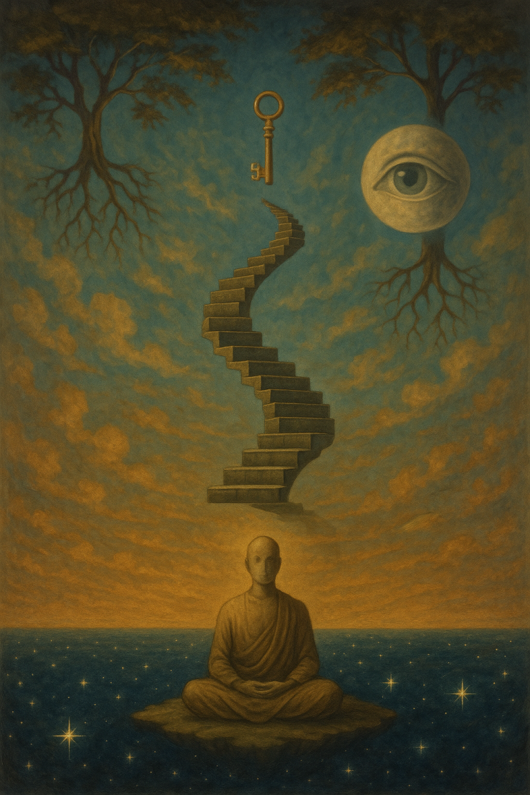 Een figuur zit in stilte, gedragen door een eiland van sterren. Boven hem kronkelt een trap de hemel in, richting een sleutel en een alziend oog – omringd door wortelbomen die boven groeien in plaats van onder.