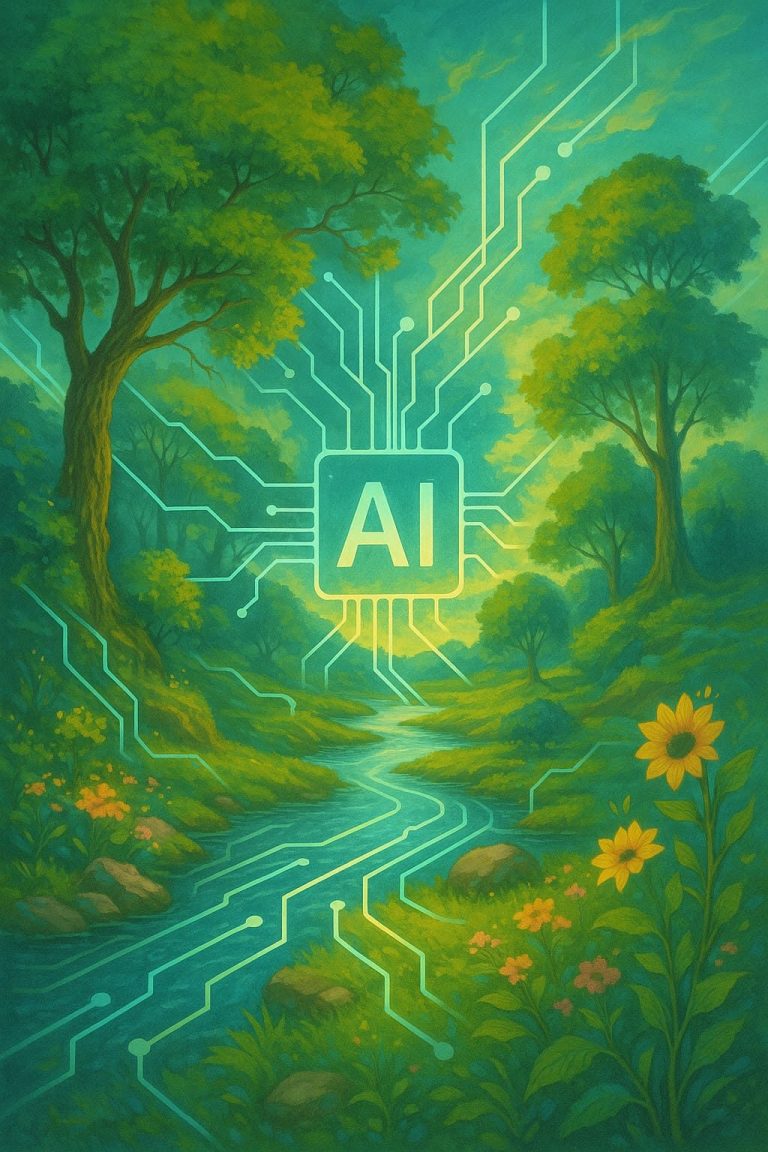 Digitale Eden vangt het moment waarop kunstmatige intelligentie niet langer tegenover de natuur staat, maar ermee versmelt. In dit werk vloeien organische vormen zoals bomen, bloemen en rivieren naadloos over in geometrische patronen en lichtlijnen die de aanwezigheid van AI symboliseren. De compositie nodigt de toeschouwer uit om na te denken over een toekomst waarin technologie en natuur niet in conflict zijn, maar in harmonie samenwerken. Een ode aan een mogelijke wereld waarin groei, bewustzijn en systeemlogica samen bloeien.