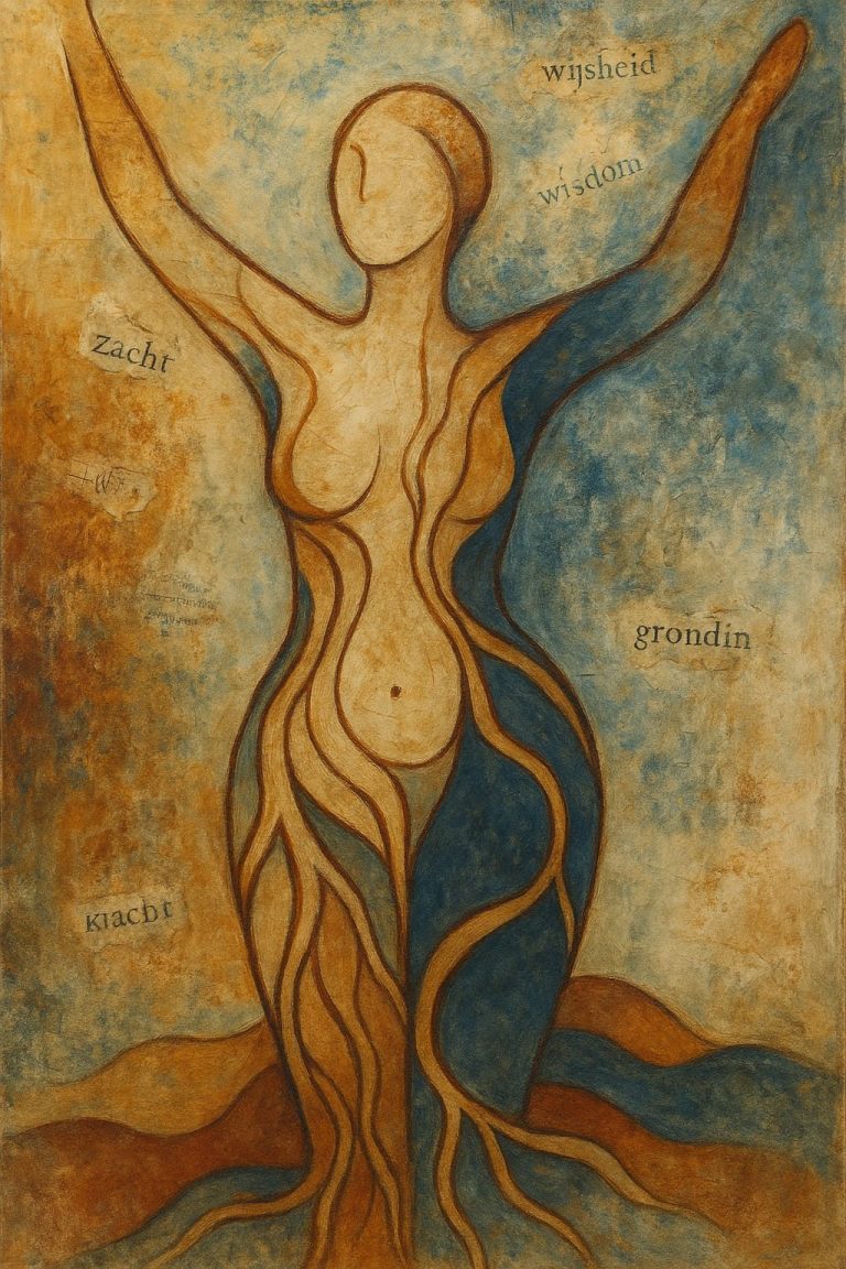 De figuur, zonder gelaat, symboliseert het universele en het tijdloze. Rond het lichaam vloeien woorden als “kracht”, “wijsheid”, “zacht” en “grondin” — een visuele poëzie over de essentie van vrouw-zijn. De warme okertonen en diepe blauwen creëren een aards, geruststellend palet, dat rust en sterkte uitstraalt.