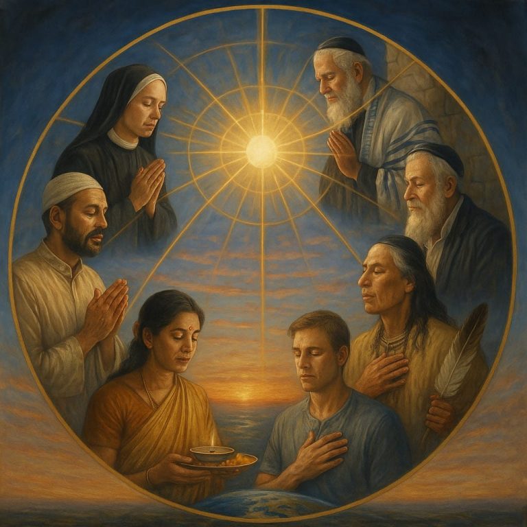De zachte lichtstralen reiken vanuit het centrum naar elk individu, en weerspiegelen de gedeelde essentie van gebed, hoop en verbondenheid. Zonder grenzen op de achtergrond, benadrukt het schilderij de visie dat — ondanks uiterlijke verschillen — onze spirituele zoektocht één oorsprong deelt.