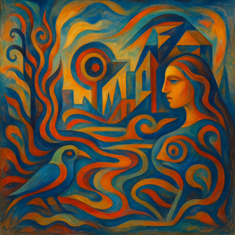 In De Echo van Stilte verweeft de kunstenaar het mystieke met het menselijke in een visuele symfonie van kleur en vorm. Het werk balanceert tussen abstracte droombeelden en herkenbare motieven zoals een vrouwelijk silhouet, een vogel, en een vervreemdend stadslandschap. De vloeiende lijnen en felle contrasten in rood, blauw en oranje creëren een pulserende beweging die doet denken aan innerlijke onrust of verborgen verhalen.