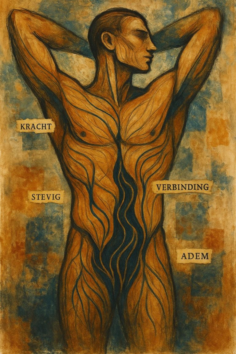 "Vadergrond" is een krachtig mixed-media schilderij dat het mannelijk lichaam op abstracte wijze verbindt met elementen uit de natuur. De figuur is opgebouwd uit vloeiende lijnen en patronen die doen denken aan wortels, rivieren en aderen — een symbool voor verbinding, adem en stevigheid.