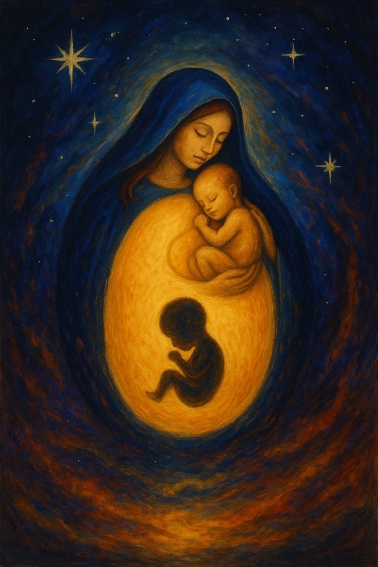 De Oerbron is een symbolisch kunstwerk dat de mystieke kracht en kwetsbaarheid van geboorte verbeeldt. In een kosmische ruimte van sterren en wervelende energieën houdt een serene figuur — half moeder, half godin — een gloeiende eivormige kern vast. Hierin rust zowel een pasgeboren kind als de silhouet van een ongeboren ziel, verbonden door licht. Het werk roept thema’s op van oorsprong, continuïteit en de eeuwige cyclus van leven. Door de samensmelting van menselijkheid en universum nodigt dit schilderij de toeschouwer uit om geboorte niet slechts als begin, maar als kosmisch moment van verbondenheid te zien.