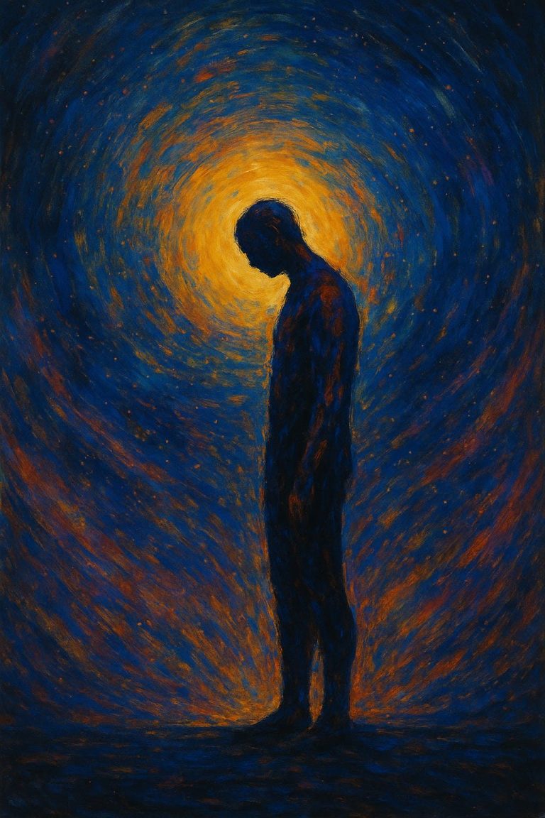 In het Oog van het Al is een contemplatief kunstwerk dat de menselijke ervaring plaatst tegenover het oneindige. In het centrum staat een silhouet, neergelaten hoofd, omringd door een kolkende kosmos van licht en duisternis. De gouden gloed achter het hoofd suggereert zowel verlichting als eenzaamheid — een visuele metafoor voor bewustzijn, kwetsbaarheid en de zoektocht naar betekenis.