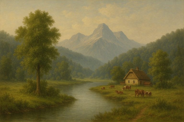 “Rust aan de Oisterwijkse Rivier” is een sfeervol olieverfschilderij dat de serene schoonheid van het Brabantse landschap vangt. In deze compositie slingert een rustige rivier zich door een weelderige vallei, omlijst door majestueuze bergen en dichtbegroeide bossen. Op de oever staat een charmant boerderijtje, waar een groep grazende koeien vredig samenkomt — een subtiele ode aan het landleven.
