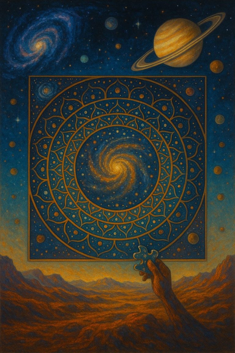 Dit buitenaardse kunstwerk, geschilderd door een hypothetische kunstenaar uit een verafgelegen melkwegstelsel, getuigt van een diepe contemplatie over de orde van het universum. Het schilderij combineert geometrische precisie met kosmische mystiek: een mandala-achtige structuur zweeft in de ruimte als een raamwerk dat een sterrenstelsel omvat. Vanuit een surrealistisch landschap reikt een hand — wezenlijk maar niet menselijk — een puzzelstukje aan richting de kosmische mandala.
