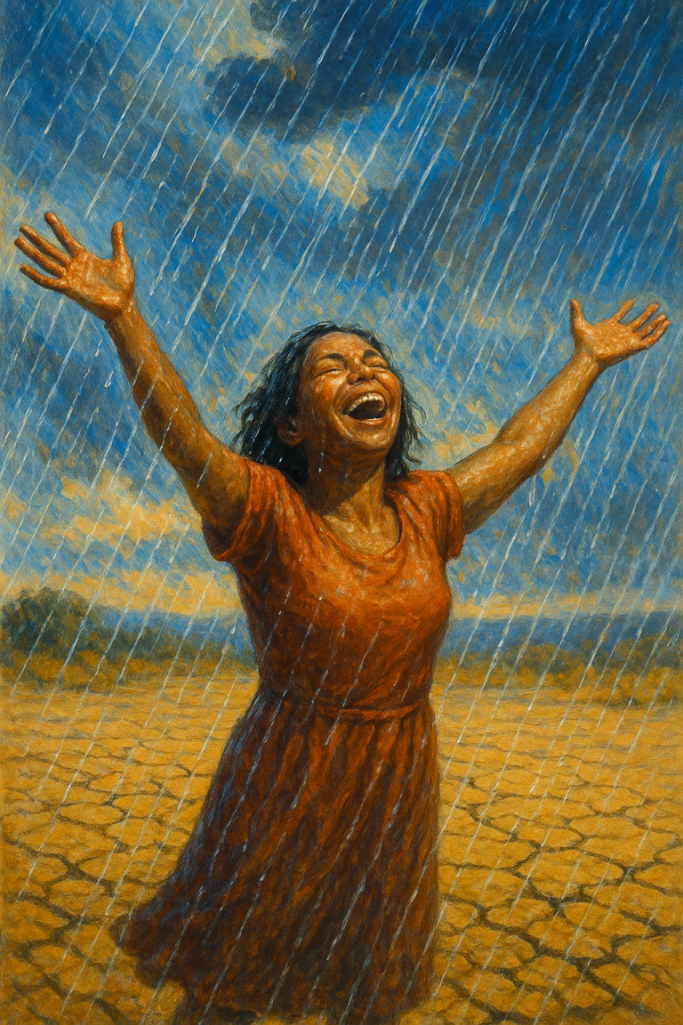 Na maanden van ondraaglijke droogte barst de hemel eindelijk open in een zeldzaam en kostbaar moment van verlossing. Eerste Regen vangt de rauwe emotie van vreugde, dankbaarheid en hoop die zich ontlaadt wanneer de eerste regendruppels de dorre aarde raken. De centrale figuur – een vrouw met open armen en een stralende glimlach – symboliseert niet alleen fysieke verlichting, maar ook innerlijke bevrijding. De regen is hier meer dan water: het is een zegen, een antwoord, een wedergeboorte. Dit werk viert de kracht van de natuur én de menselijke ziel die ondanks ontbering blijft hopen.