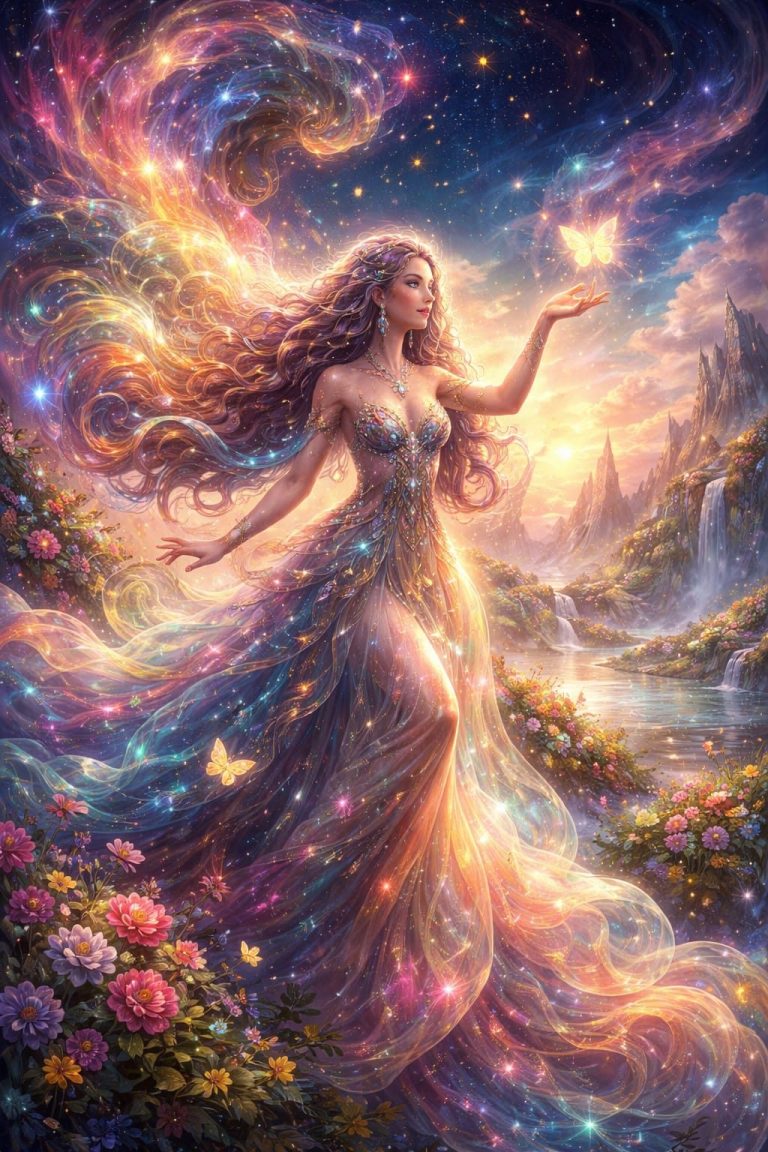 De Fluistering van het Kosmisch Licht toont een etherische figuur die balanceert tussen droom en werkelijkheid. Haar golvende gewaad en haar lijken geweven uit sterrenstof en nevels, waarin licht, kleur en beweging samensmelten tot één kosmische ademhaling. Om haar heen ontvouwt zich een betoverd landschap van bloeiende bloemen, stromend water en zwevende werelden, badend in een zachte gloed.