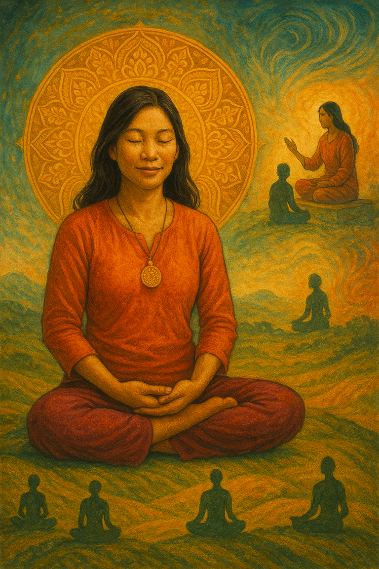 Innerlijke Gave is een spiritueel geïnspireerd kunstwerk dat de rust en kracht van meditatieve toewijding uitbeeldt. In een landschap doordrenkt met warme aardetinten en etherische patronen, zit een vrouw in diepe meditatie – een symbool van innerlijke balans, dienstbaarheid en spirituele groei. Omringd door leerlingen in stilte, straalt ze wijsheid en rust uit, belichaamd door de mandala die achter haar schittert als een zon van bewustzijn. Dit werk eert het vrijwilligerswerk in yoga en meditatie als een daad van liefde en verbinding, en nodigt de toeschouwer uit tot introspectie en overgave aan het moment.