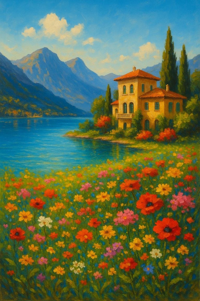 “Zomer aan het Gardameer” is een levendig en romantisch schilderij dat de mediterrane pracht van Noord-Italië viert. Het werk toont een elegante villa aan de oever van het Gardameer, omringd door een zee van kleurrijke bloemen die dansen in het zonlicht. Op de achtergrond rijzen imposante bergen op, die het geheel omlijsten en een gevoel van grootsheid en rust oproepen.