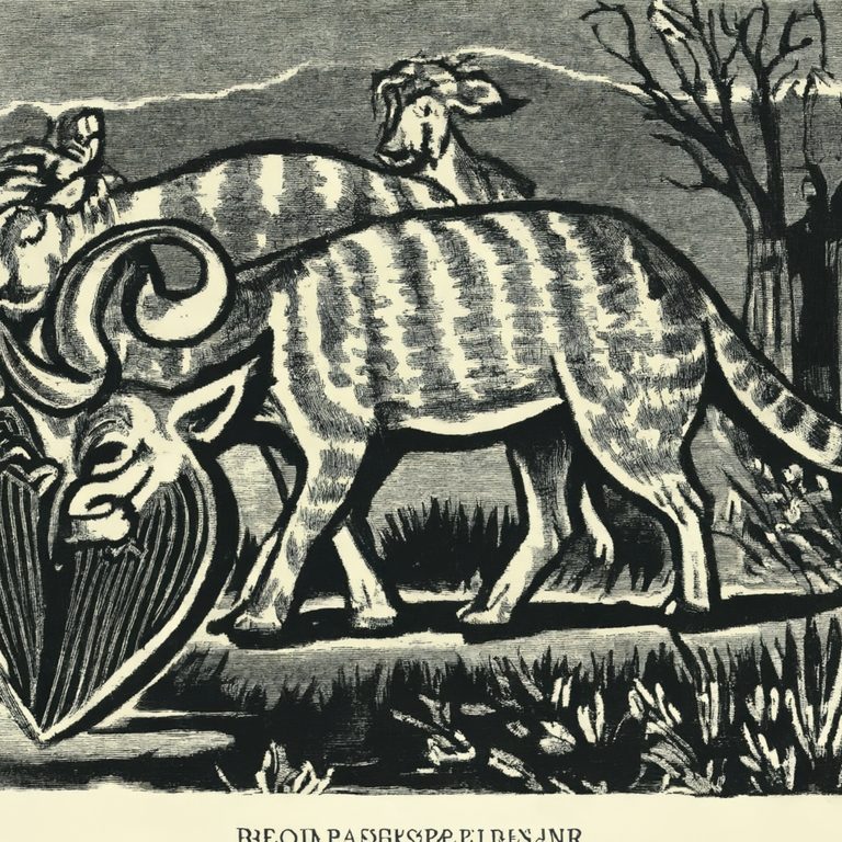 De compositie combineert natuurlijke elementen met een grafische scherpte die doet denken aan expressionistische prenten uit het begin van de twintigste eeuw. De stilte in de achtergrond contrasteert met de beweging van de dieren, wat een gevoel van zowel spanning als sereniteit oproept. Dit werk nodigt de toeschouwer uit om de grens tussen natuur en verbeelding opnieuw te verkennen.