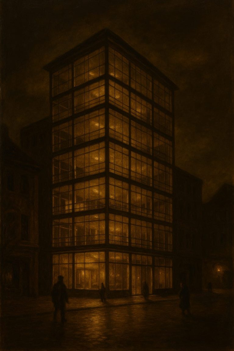 Dit schilderij toont het Glaspaleis in Heerlen in een sfeer die sterk doet denken aan de stijl van Rembrandt. De nadruk ligt op dramatisch licht en donker—chiaroscuro—waarbij het gebouw oplicht als een lantaarn in een verder duistere stad.